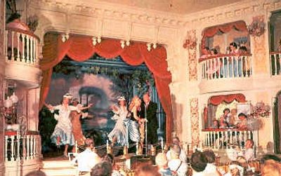 "No alcohol is served in this saloon, which is underwritten by Pepsi-Cola and features such as Dolores, a singing waitress who renders such songs as 'Alice Blue Gown'. An Irish tenor sings Irish tunes. Slue Foot Sue, the tough proprietress sings 'Won't You Come Home Bill Bailey". Pepsi-Cola is the most powerful beverage allowed at Disneyland."