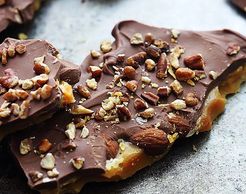 Pour onto a greased cookie sheet cover the hot mixture with the choclate bars and nuts and wait until these are melted, and then eventually cool.