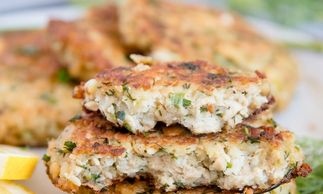 Place salmon in bowl and remove the spine bones at the center of the pieces. Break up the salmon and add all ingredients. Mix well and form into patties, Placed in a lightly greased skillet on medium heat and cook on both sides until the outsides turn a golden brown.