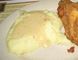 Scrape fried chicken dripping from pan with a wooden spoon to release the crusty bits left. Add some water and 2 bouillon cubes to the pan. Add flour and blend over a low heat until ingredients and flour are a golden brown. Add milk and salt and cook over a low heat for 5 minutes, stirring regularly. Add chicken pieces and mix well. Serve immediately over the potatoes.