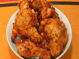 Cover chicken with salted water and soak for 45 minutes. Drain chicken and pat dry. Coat each piece with flour and shake off any excess. Bring oil to a boil in an 8 1/2 quart saucepan and drop in chicken pieces. Cover and fry for 45 minutes. Remove chicken and drain on a paper towel. Fifteen minutes before serving, heat 1/4 cup of oil in a large skillet and re-fry for 3 minutes.