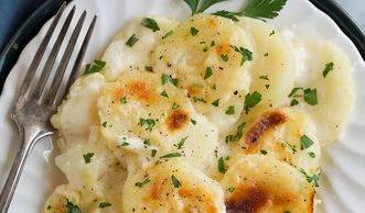 Melt the butter in a skillet over a medium heat and add onions until tender. Stir in soup, milk and pepper. Heat to boiling and add potatoes. Reduce heat to low. Cover and simmer for 5 minutes or until ht and bubbly. Stir occasionally. For added flavor, add 1/4 cup of cheddar cheese.